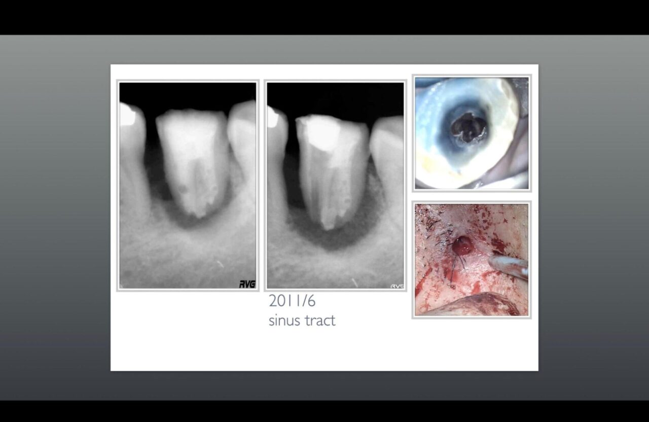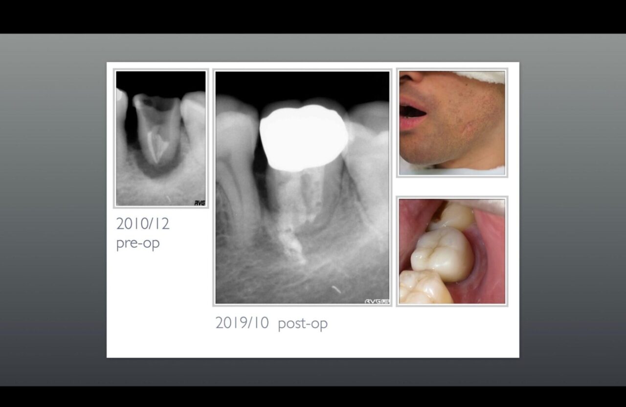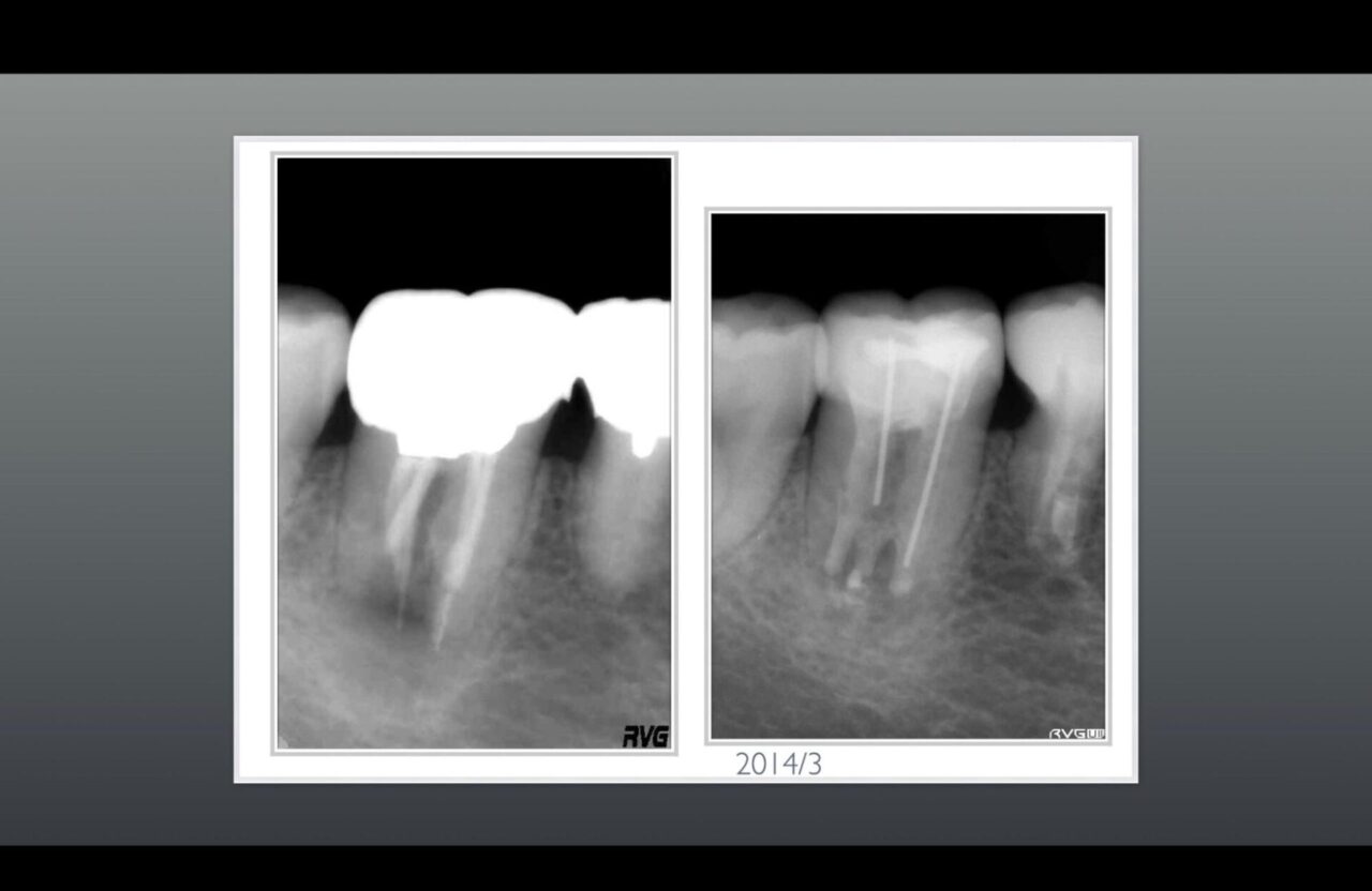 この歯の治療は、最初1回法で根管充填、ファイバーポストまで1日で行ったが頬からのサイナストラクト、フィステルが消失しないため、6ヶ月後に近心根のみもう一度根管治療を行った。頬側からの掻爬や、物理的、化学的洗浄を十分に行いバイオセラミックで根管充填をした症例です。