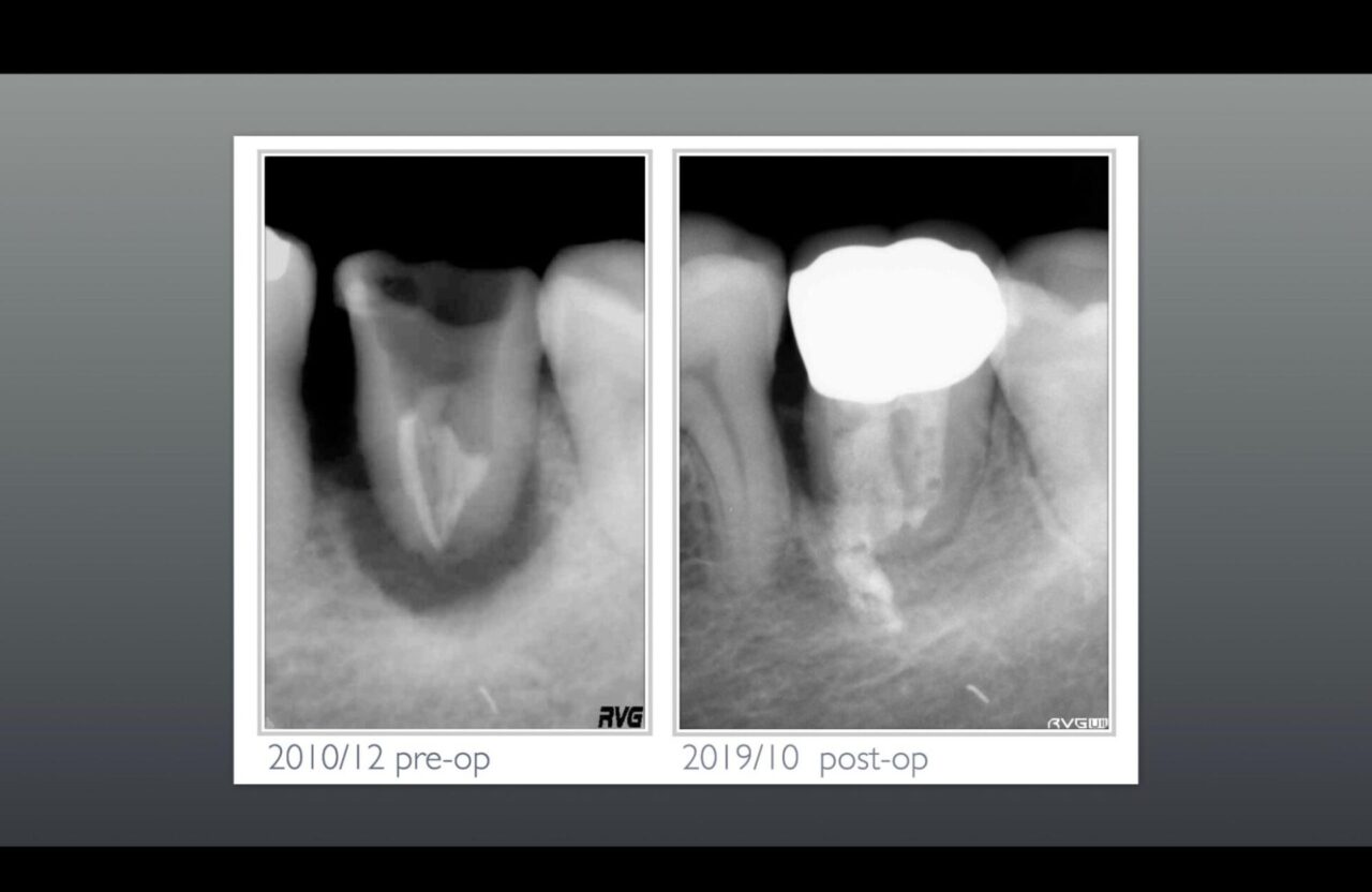 術後のレントゲン写真では、根尖部の骨は再生され根管内にあった異物はきちんと除去されている。