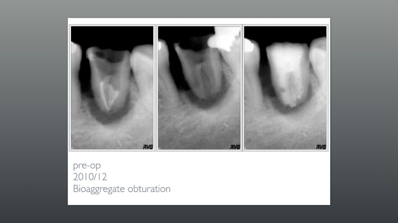 左から術前のレントゲン、術中根管の内容物を除去した直後のレントゲン写真、バイオセラミックスによる根管充填、レジンコアを行った後のレントゲン写真。