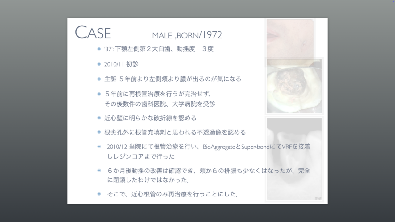 また患者の主訴は、頬から膿が出る事が5年以上前より続いている事から、都内の大学病院を数件行ったが、一向に治らず、根管治療の吉松歯科医院の以前のホームページを見て来院に至りました。